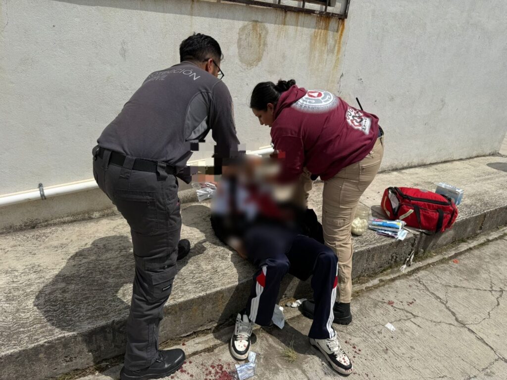 Primero, intentó agredir a la compañera, pero el estudiante intervino, recibiendo el ataque en el cuello con lo que, aparentemente, era un cúter. La lesión le provocó una hemorragia activa, por lo que personal de Protección Civil acudió de inmediato y trasladó al menor a la Clínica 2 del IMSS en Apizaco, donde ingresó a la sala de choque para recibir atención especializada.