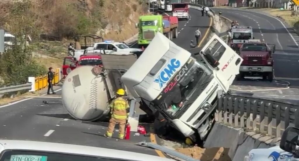 Vuelca pipa con 30 mil litros de gasolina; cierran paso en la Apizaco-Tlaxcala